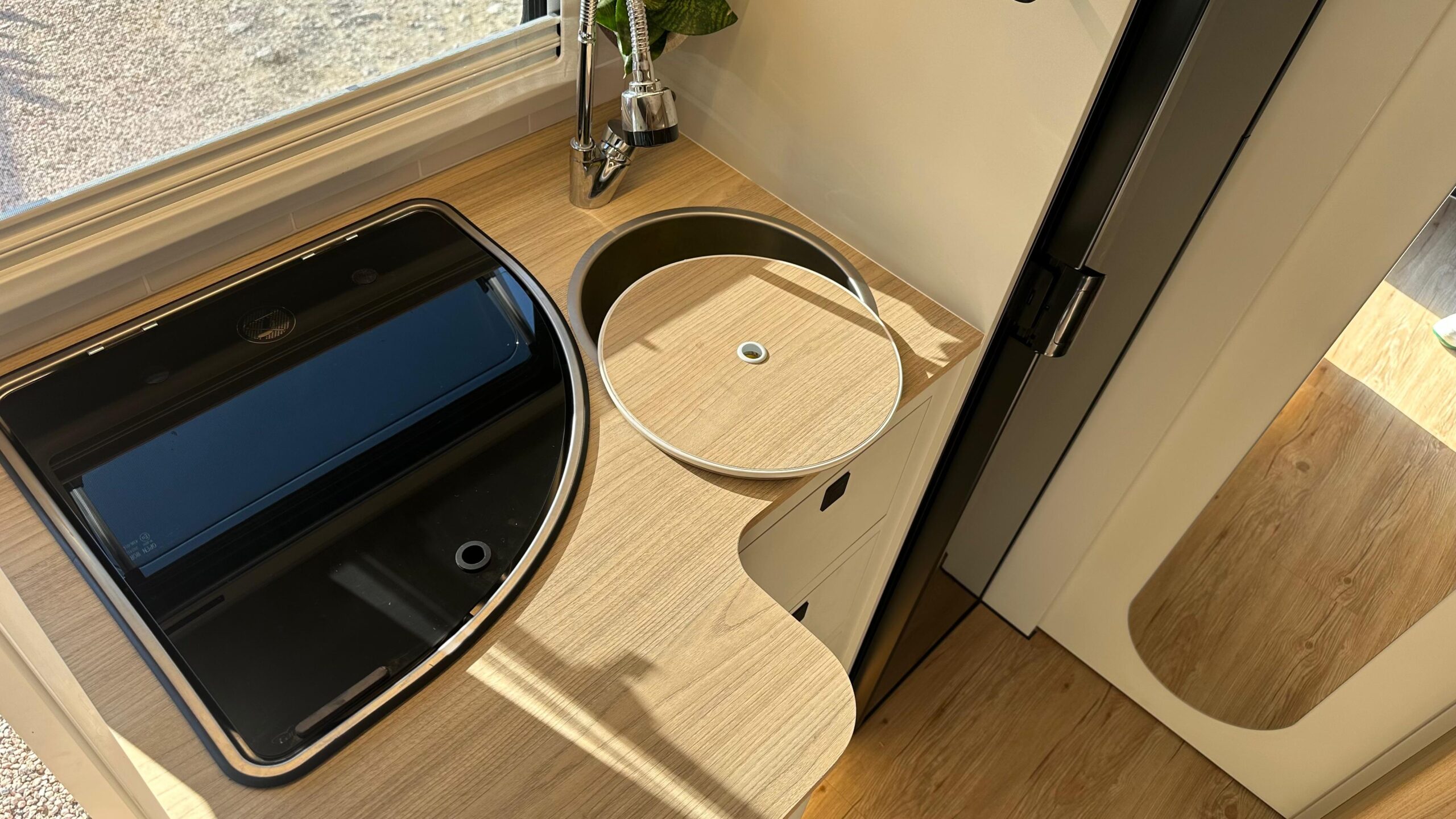 • Fogão cooktop 1 boca na cozinha externa com acesso aos compartimentos internos do motorhome;