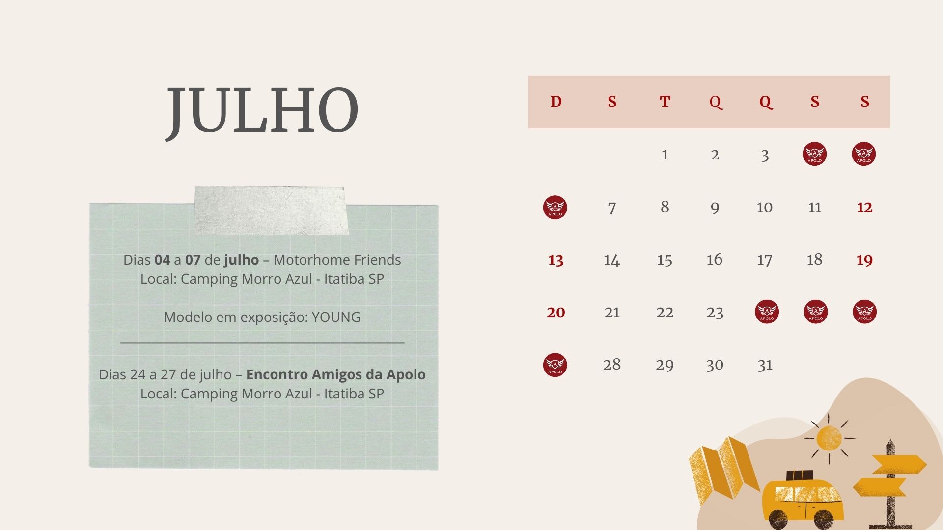 A Apolo foi convidada para participar do encontro Motorhomes Friends, para quem ama viajar com liberdade e conforto. Estaremos com o trailer Young , que estará disponível para visitação em meio à natureza, no acolhedor Camping Morro Azul.
