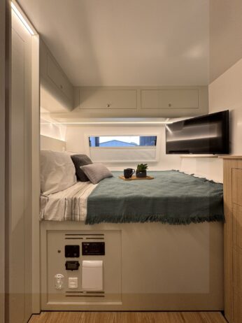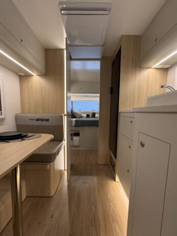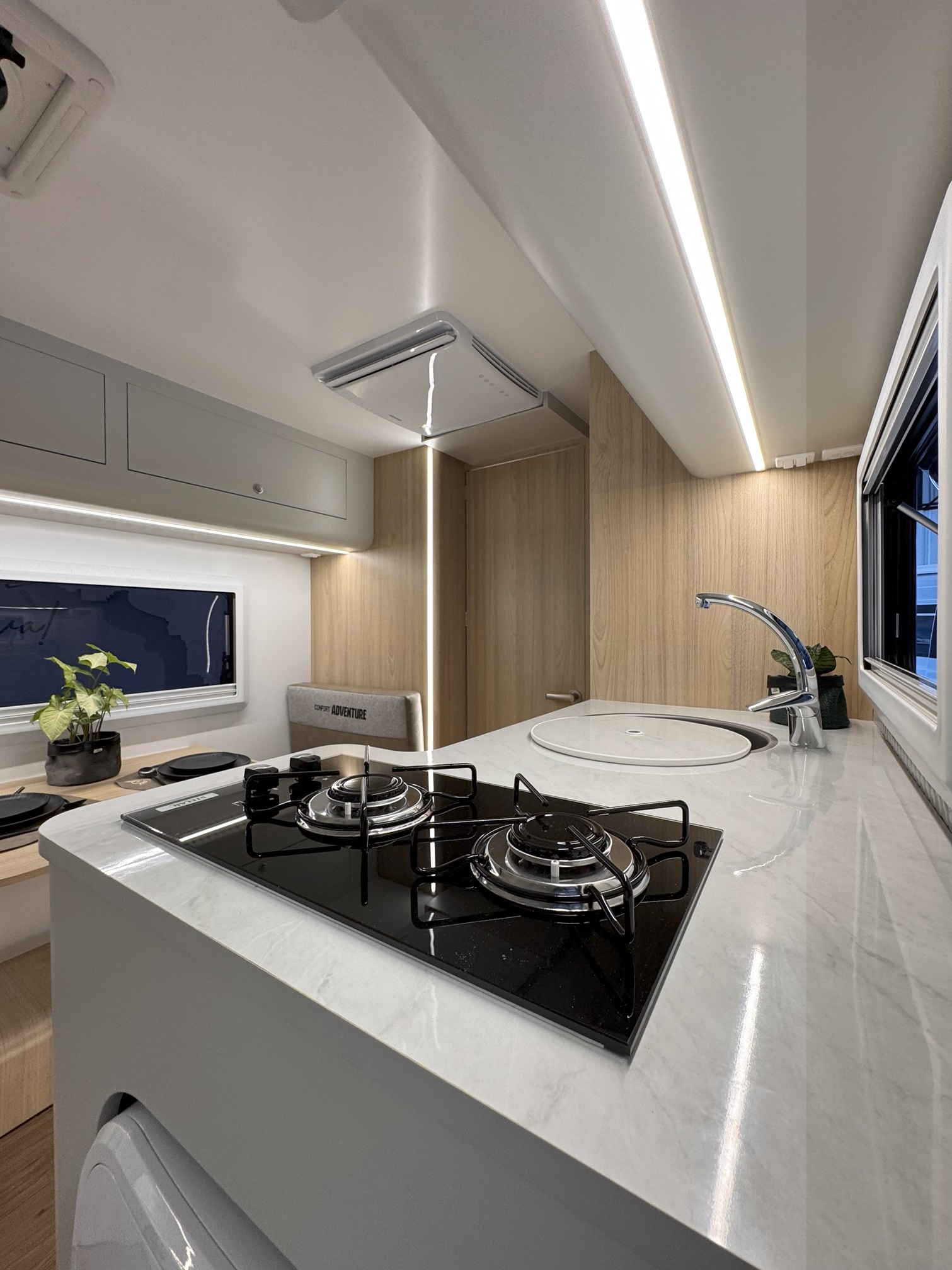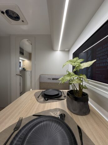 Ideal para 3 ou 4 pessoas, o Confort Adventure preserva o quarto fechado com cama de casal, garantindo total privacidade para o casal, além da dinete que se transforma em cama de solteiro. Também é possível instalar uma cama extra sobre a dinete para acomodar uma quarta pessoa. Sua cozinha completa e o banheiro com box separado tornam qualquer viagem prática e confortável — seja no asfalto ou na estrada de terra.