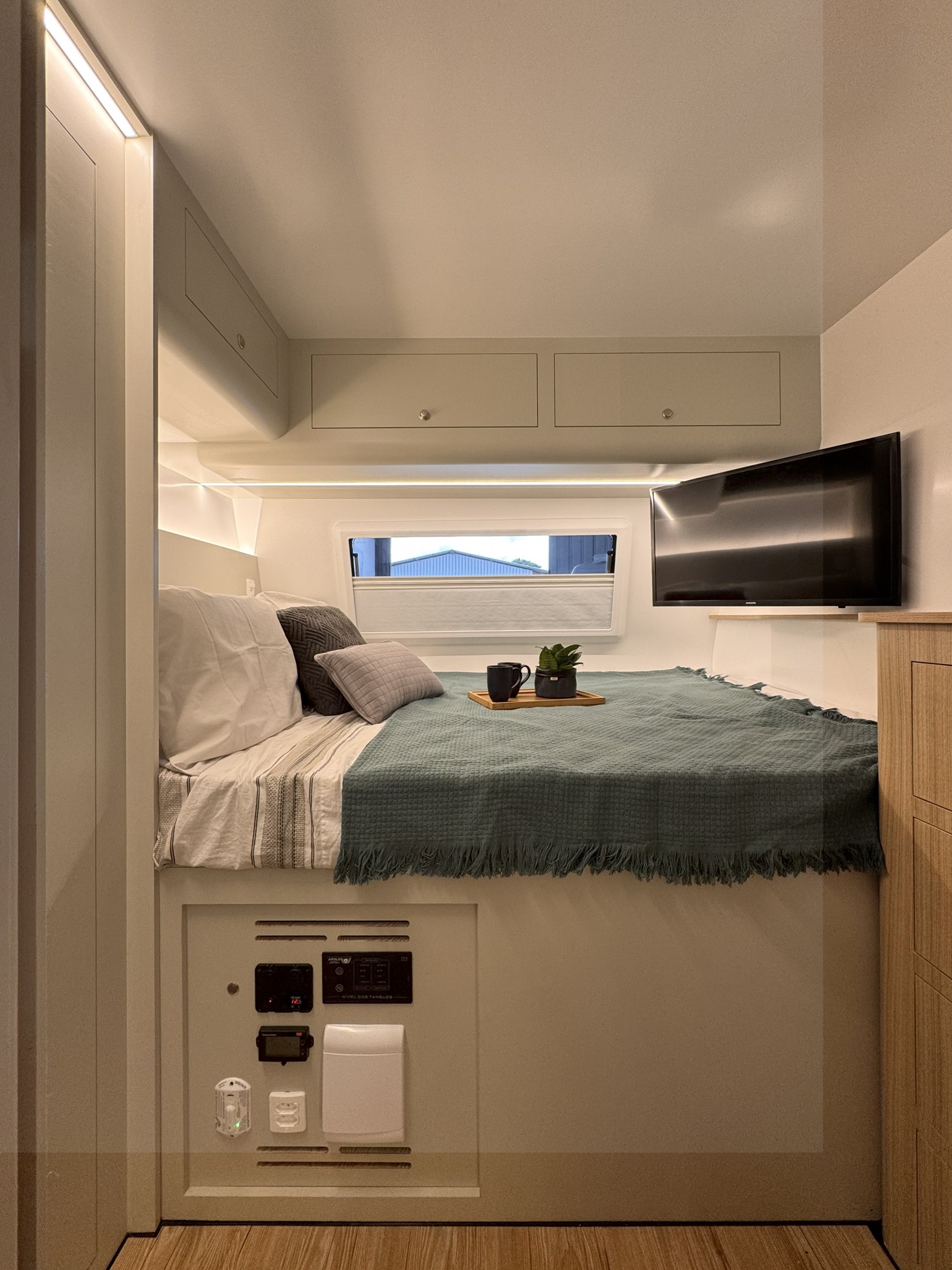 O quarto fechado com cama de casal (2 x 1,45m) oferece um espaço reservado e acolhedor. A dinete (1,95m x 0,70m) se transforma em uma cama de solteiro, e a cama extra opcional permite acomodar uma quarta pessoa com comodidade. - Cozinha Completa e Funcional: