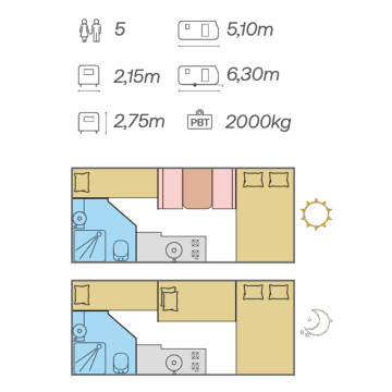 • Acomodações para Cinco Pessoas: Com uma cama de casal fixa de 1,30m x 2m, um beliche de 1,90m x 0,65m e uma dinete confortável que se transforma em cama (1,75m x 0,90m), todos têm um espaço perfeito para descansar, desde casais até famílias.